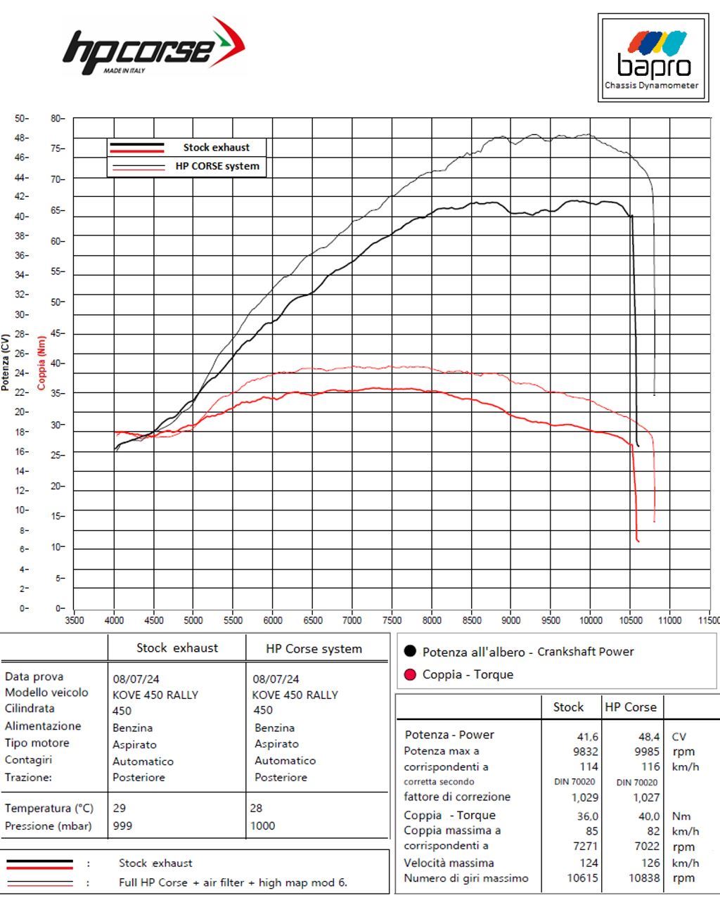 Beneficia di Prestazioni da Competizione grazie alla rimozione del catalizzatore che permette un deflusso dei gas di scarico senza ostacoli. In combinazione con il silenziatore SP-2 e la mappatura dedicata HP Corse, i test al banco hanno registrato incrementi prestazionali eccezionali: Potenza: +7 CV a 9.985 giri/min e Coppia: +4 Nm a 7.000 giri/min.