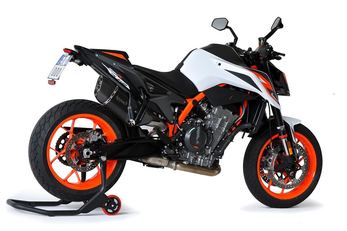 SP-3 CARBON SHORT nasce nel cuore della Motor Valley, nel Centro R&D di Bologna. Ha caratteristiche estetiche graffianti con un finale in carbonio dal taglio a forma di diamante. Lungo solo 23 cm, ha linee etreme enfatizzate da una cover in carbonio dedicata. Il corpo silenziatore può essere in Titanio oppure ceramizzato nero. Omologato Euro 5 senza DB Killer in quanto rientra nella tolleranza dei parametri fonometrici previsti. Testato al banco, in pista e sulle strade di tutti i giorni, SP-3 CARBON SHORT garantire affidabilità, assicura prestazioni superiori a tutti i regimi rispetto allo scarico originale della KTM 890 DUKE R. Dotato di un raccordo slip-on per i collettori originali.