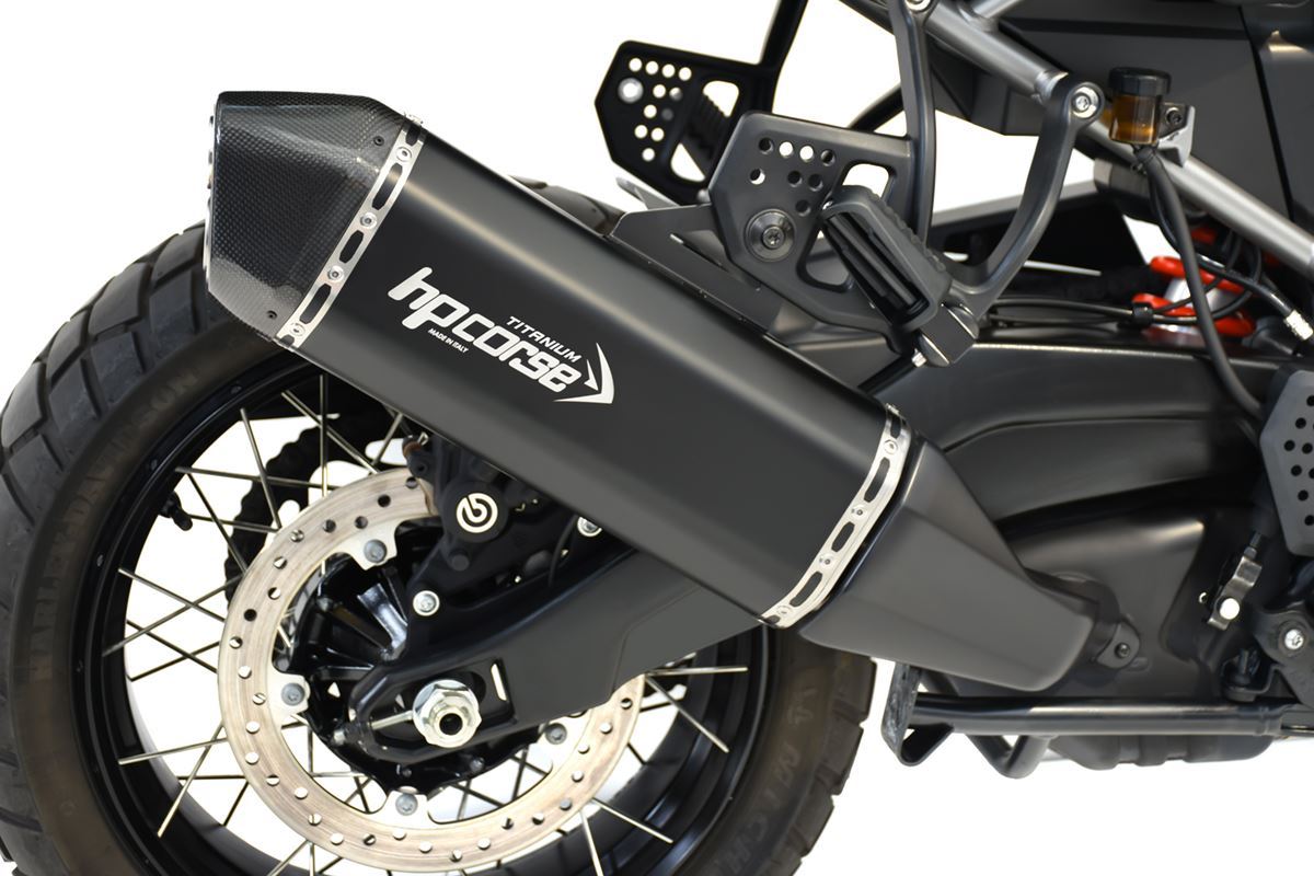 The HP CORSE exhaust system for the Pan America 1250 redefines American Adventure Touring standards, blending an exclusive octagonal design with an ultra-lightweight Titanium construction.